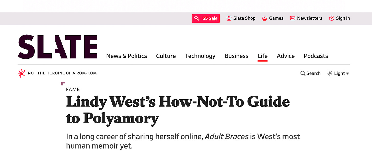 The online pile on West’s memoir has received is not as if someone broke into her house and read her diary. West produced an artistic work that has generated much discussion. That’s the business. It’s perhaps not what the author wanted, but that’s true of many artistic works that receive negative feedback. West herself has written scathing reviews of other people’s work, such as Sex and the City 2 and Love Actually. There are people who share West’s Love Actually take down every year, which I think is sad — not because I love the film but because more than 3000 people probably watch it for the first time during the holidays and enjoy it. That is what tends to endure. West has had a lot to say about creative efforts and activities other people might enjoy that she didn’t appreciate, but she titled at windmills that were objectively larger than her own work. All this fuss over Adult Braces can’t help but feel like punching down or wasting everyone’s time.