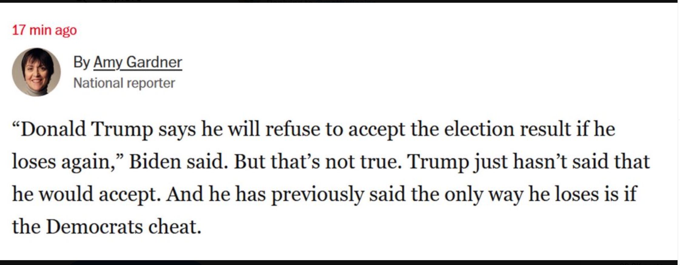 “‘Donald Trump says he will refuse to accept the election result if he loses again,’ Biden said. But that's not true. Trump just hasn't said that he would accept. And he has previously said the only way he loses is if the Democrats cheat.”