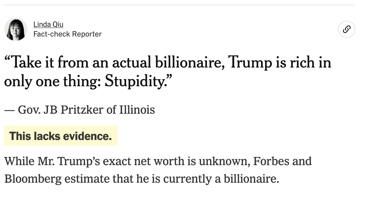 Hammering Trump, as is proper, Pritzer said, “Take it from an actual billionaire, Trump is rich in only one thing: Stupidity.” Qiu responds, “While Mr. Trump’s exact net worth is unknown, Forbes and Bloomberg estimate that he is currently a billionaire.”