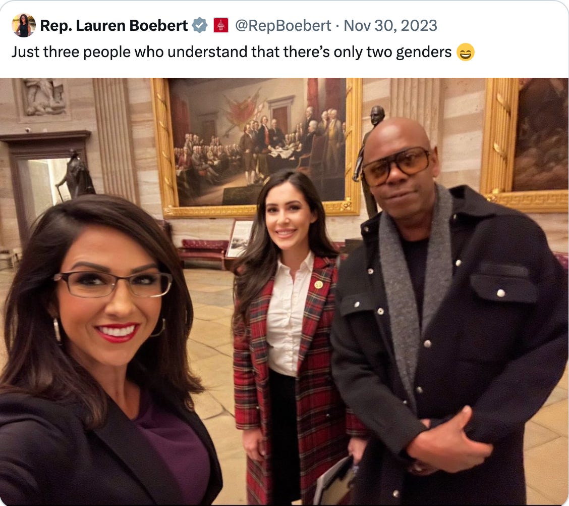 That was probably a joke. I’ll give him that. It was just mean, which is why both Dave Chappelle and Lauren Boebert are more suited for an open-mic night at the Chuckles Hut than whatever it is they actually do.