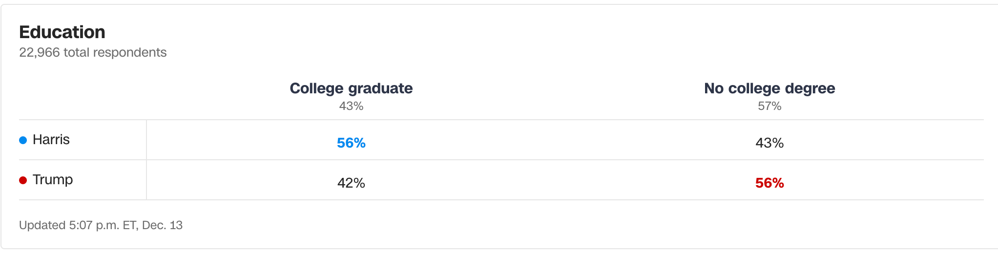 Kamala Harris won voters who are well informed and get their news through traditional means. Trump won irregular voters who primarily get their news through social media and aren’t as well-educated as Harris voters. Obviously, a college degree doesn’t mean you’re smart, but neither is auditing courses at Joe Rogan University.