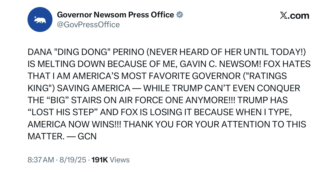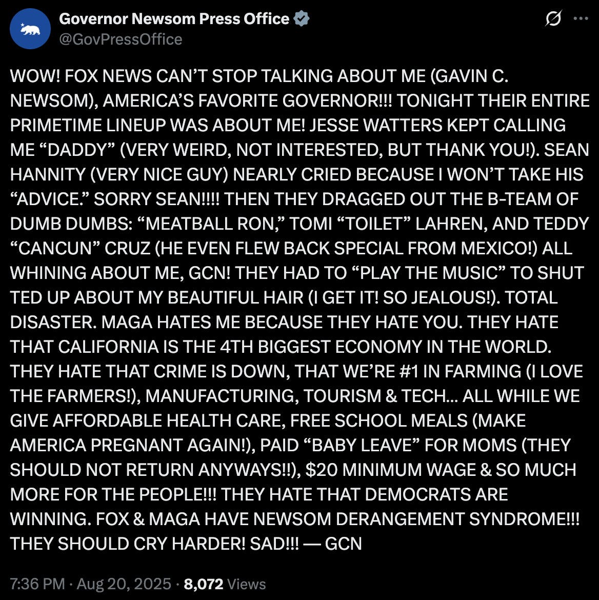 Of course, Newsom doesn’t personally write these posts, which is not surprising. Politicians have long had speech writers. Newsom has hired a communications director who is smart, conscious, and alive. (Based on Democratic House Leader Hakeem Jeffries’s interviews, his comms team is 0 for 3.)