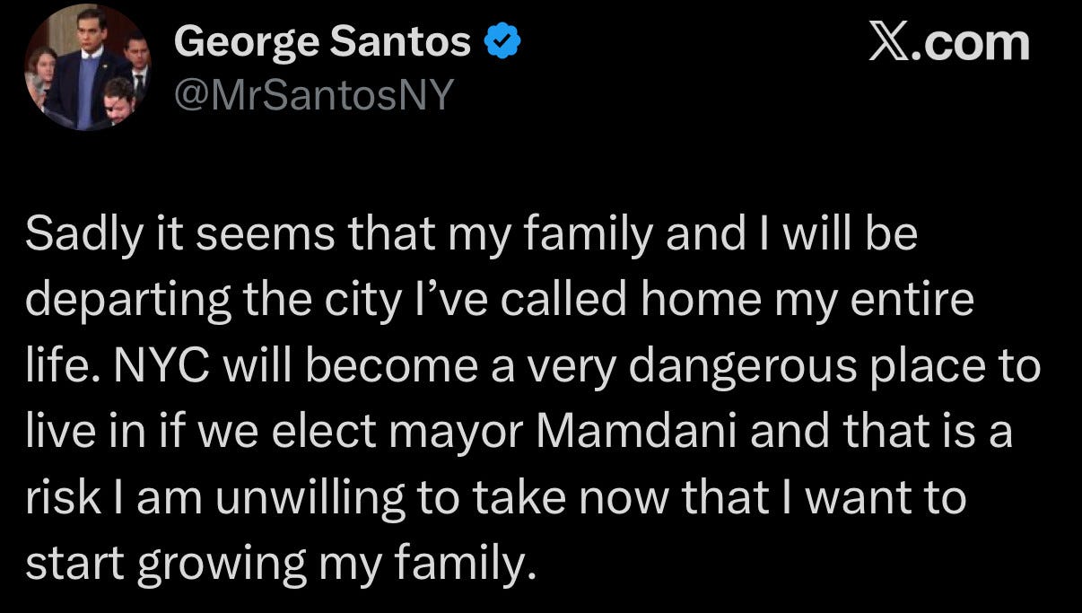 My Spidey sense says that Santos will leave NYC if his new job (with some RW grifting operation) requires it. If not, he will make some excuse for not doing so, should Mamdani be elected (with trump as president, I take nothing for granted).