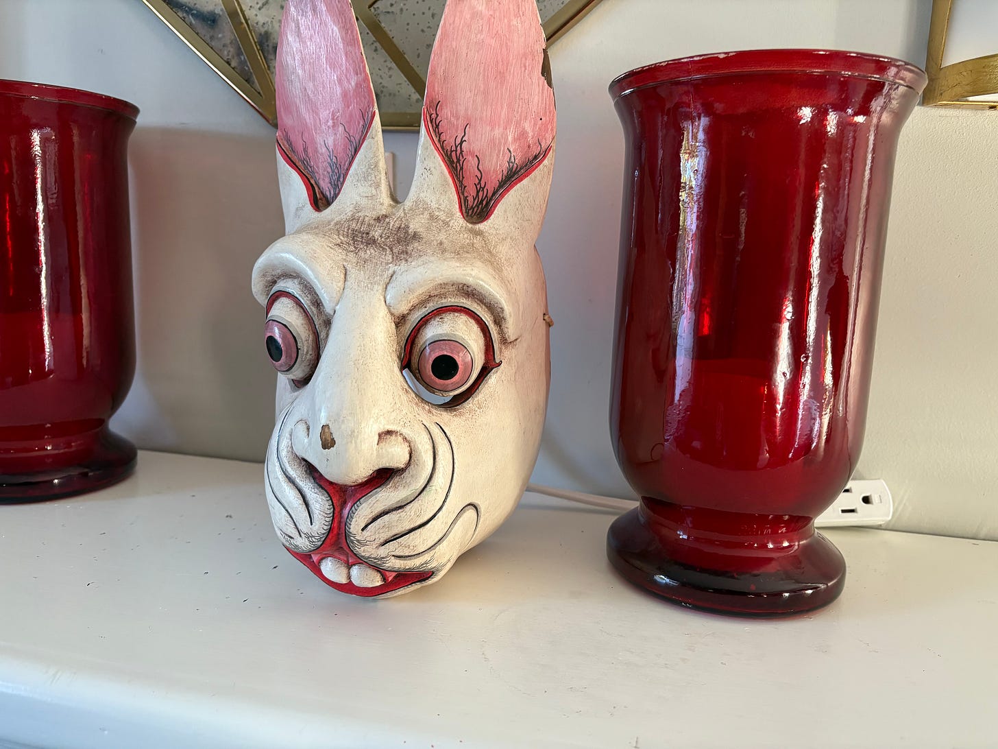 over at will post cat photos whenever he receives new paid subscribers during a promotion. I don’t have cats — well, aside from the stuffed black ones that are purely decorative and certainly were never alive at one point. However, I will start posting fun Halloween photos like this one.This is a “bunny” mask I acquired about 25 years ago when I lived in New York, and by “acquired,” I mean I found it abandoned in the basement laundry room of my apartment on West 101st St. I apparently learned nothing from every horror movie I’d ever seen. However, I’ve never actually worn the mask or felt compelled to do so, and I can confidently state that the mask has never driven me to murder anyone.