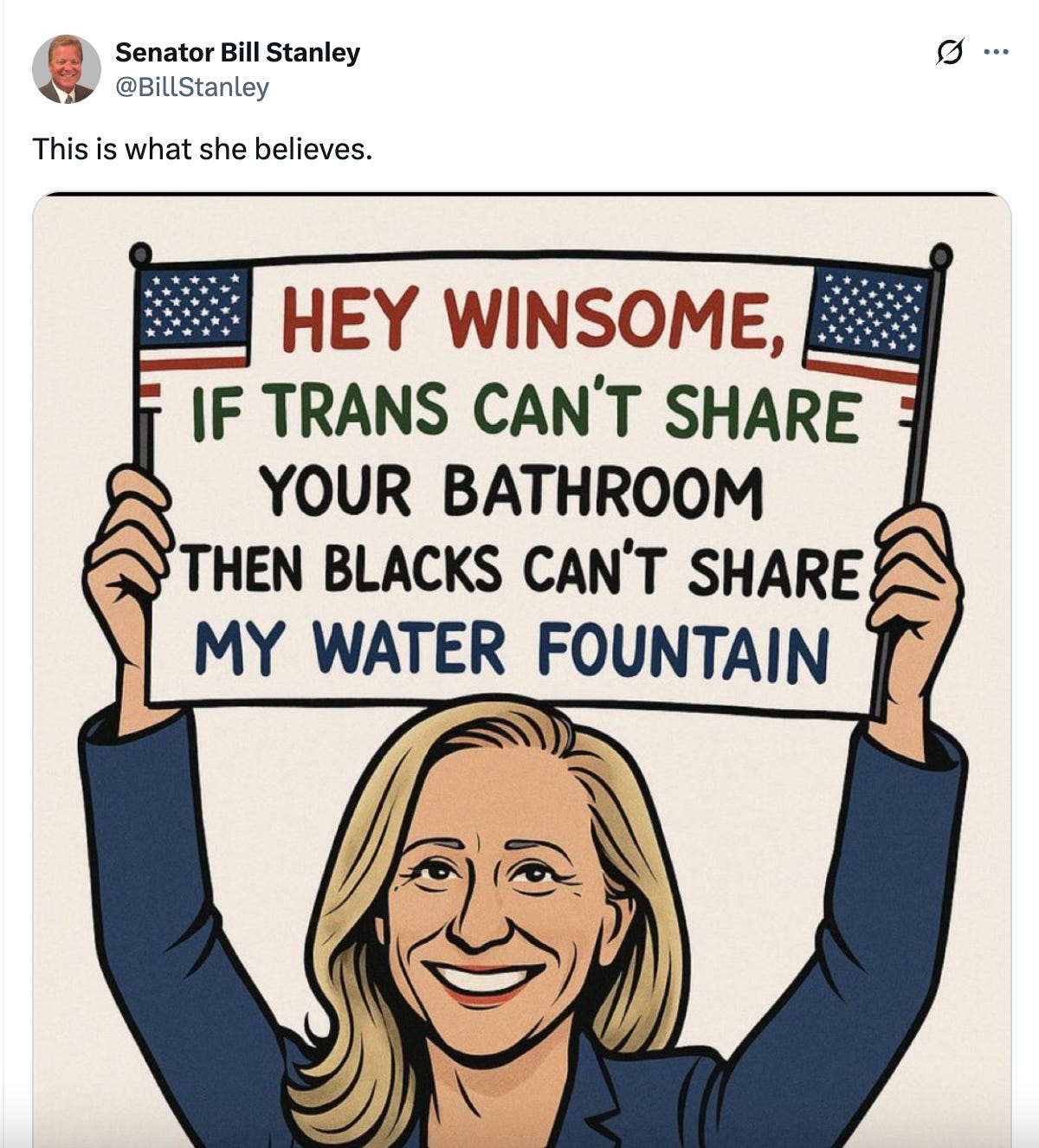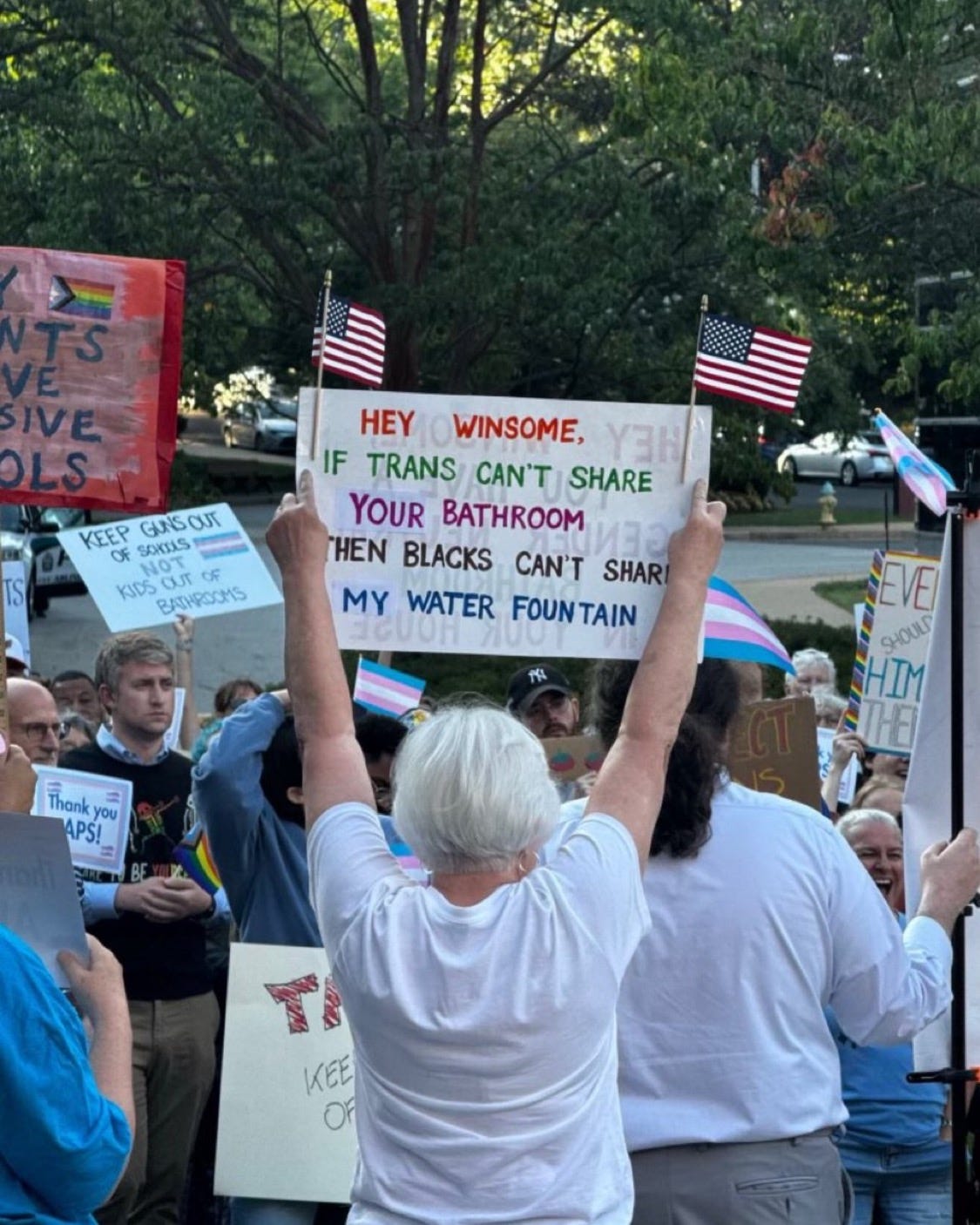 “Hey Winsome, if trans can’t share your bathroom, then Blacks can’t share my water fountain,” the sign read.
