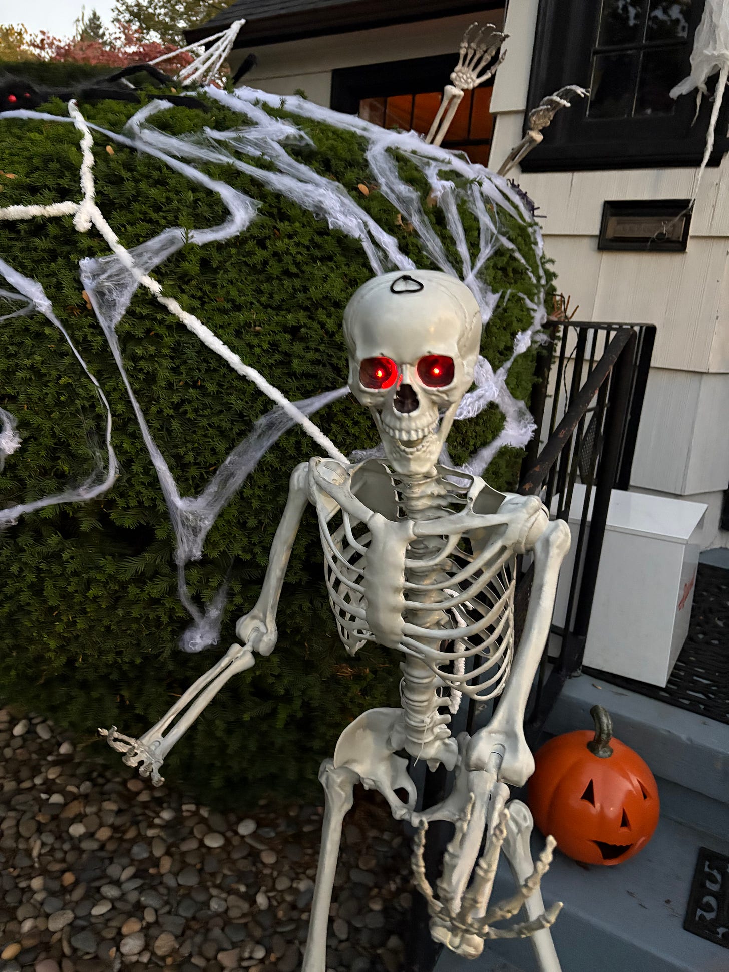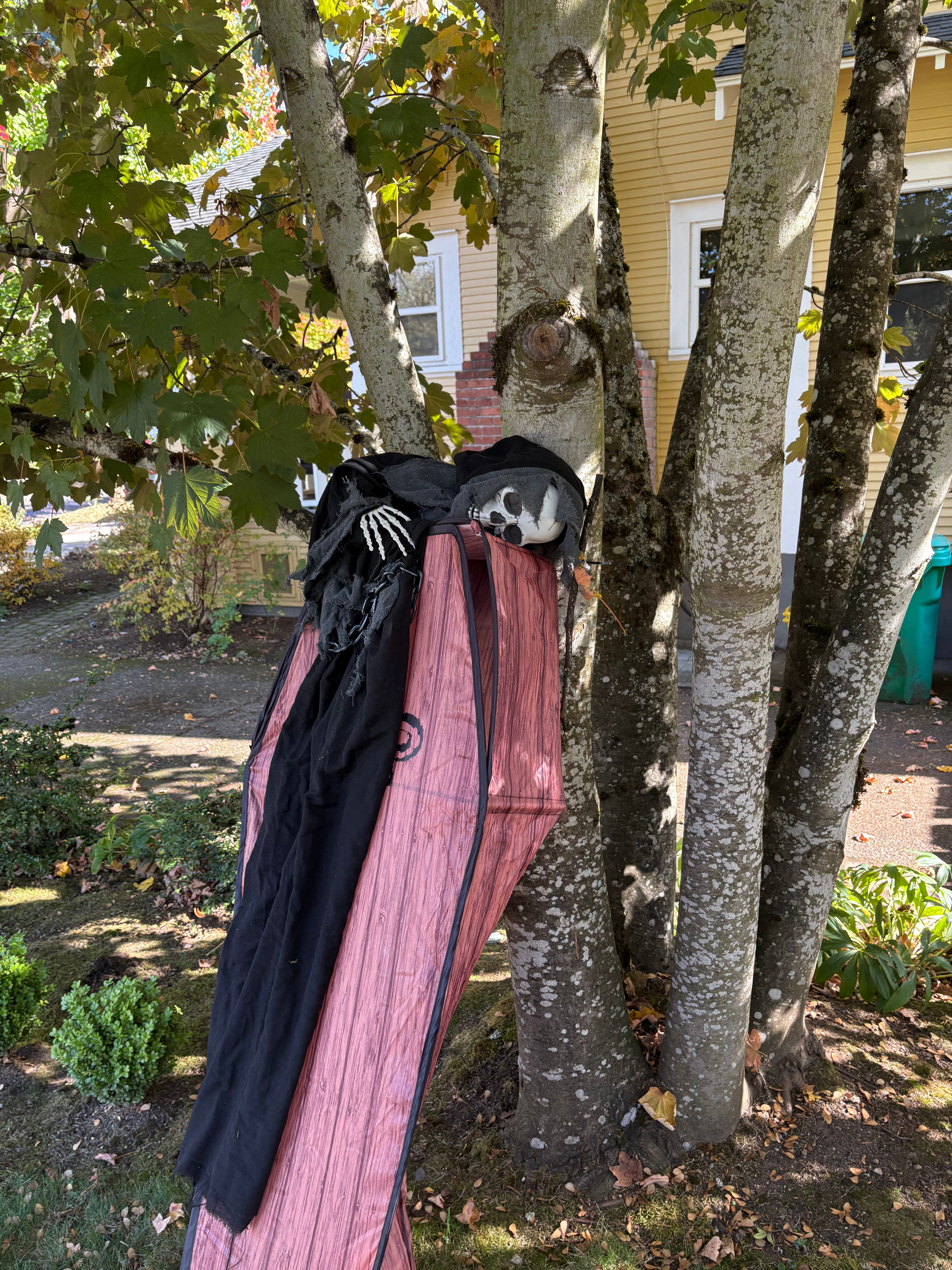 at , I’m sharing photos of my seasonal decor. Here’s the official house greeter.This is a more modestly dressed skeleton resting on a coffin after it fell from one of the branches in our tree.
