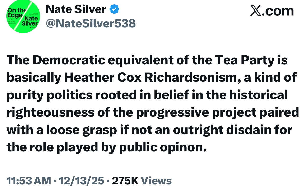 “The Democratic equivalent of the Tea Party is basically Heather Cox Richardsonism, a kind of purity politics rooted in belief in the historical righteousness of the progressive project paired with a loose grasp if not an outright disdain for the role played by public opinion.”