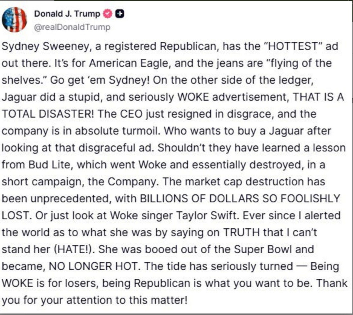 Trump was predictably delighted to learn that his fellow Floridian Sweeney is a registered Republican. He told reporters last week, “She’s a registered Republican? Ooh, now I love her ad. Is that right? Is Sydney Sweeney … You’d be surprised at how many people are Republicans. That’s what I wouldn’t have known. But I’m glad you told me that. If Sydney Sweeney is a registered Republican, I think her ad is fantastic.”