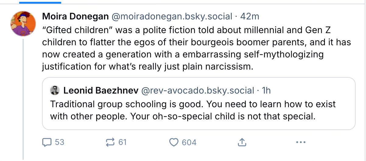 This stuff makes liberals sound crazy. It’s like how San Francisco eliminated accelerated middle and high school math classes, with justifications that were frankly insulting to minority children. (My Black son is actually extremely good at math — dare I say “gifted.”) These are people who are forming opinions in a bubble and without any real contact with normal people across the country. Even if you have genuine concerns with TAG programs, you should at least start from the position that parents want the best for their kids and aren’t just status-conscious narcissists. That is a debate ender. And if you say “bourgeois” out loud in 2025, you should feel ashamed of yourself.