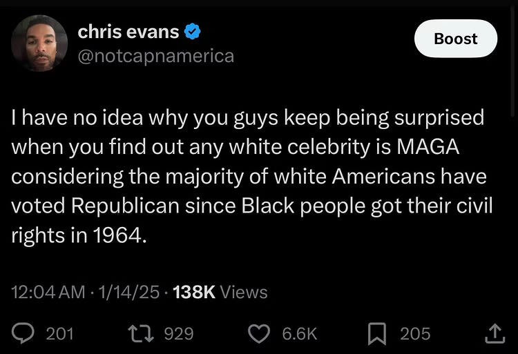 Evans wrote, “I have no idea why you guys keep being surprised when you find out any white celebrity is MAGA considering the majority of white Americans have voted Republican since Black people got their civil rights in 1964.”