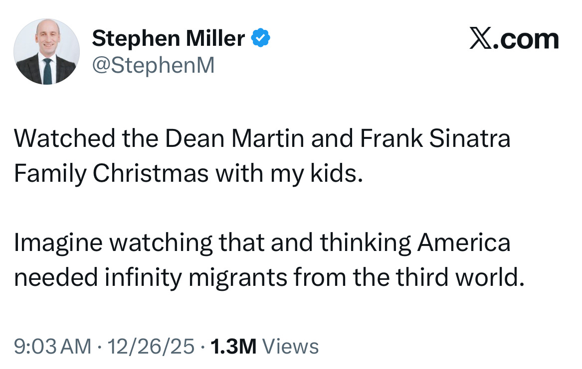 “Watched the Dean Martin and Frank Sinatra Family Christmas with my kids,” Miller wrote. “Imagine watching that and thinking America needed infinity migrants from the third world.”
