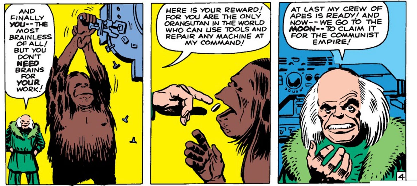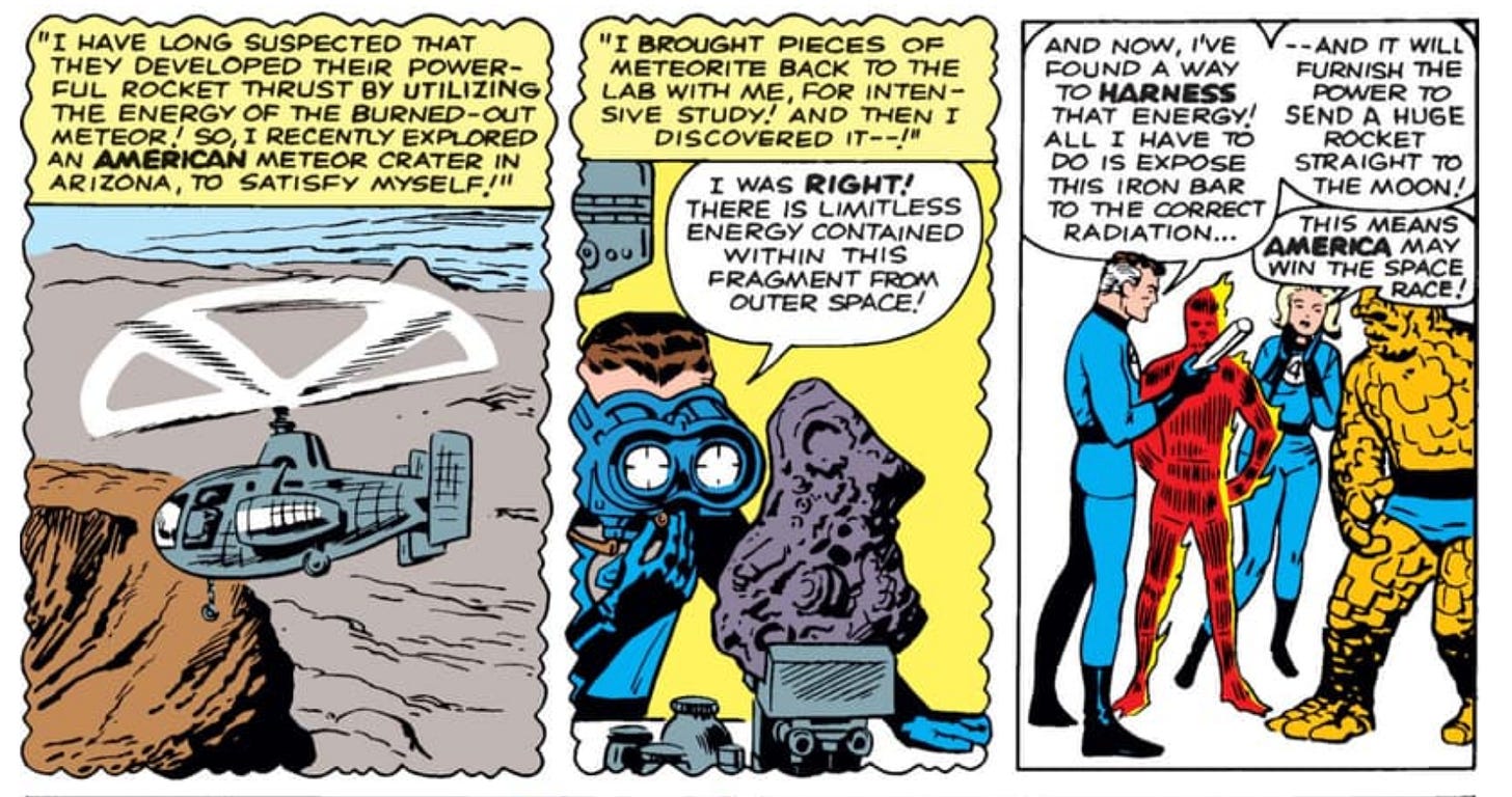The Fantastic Four’s own origin was rooted in nationalism. Sue tells Ben that they must beat the “commies” into space. One of their recurring villains is the Russian Red Ghost, a Soviet scientist who wanted to beat Americans to the moon and claim it for the Communist empire. John Malkovich had played a bowdlerized version of the villain in First Steps but his scene was cut.