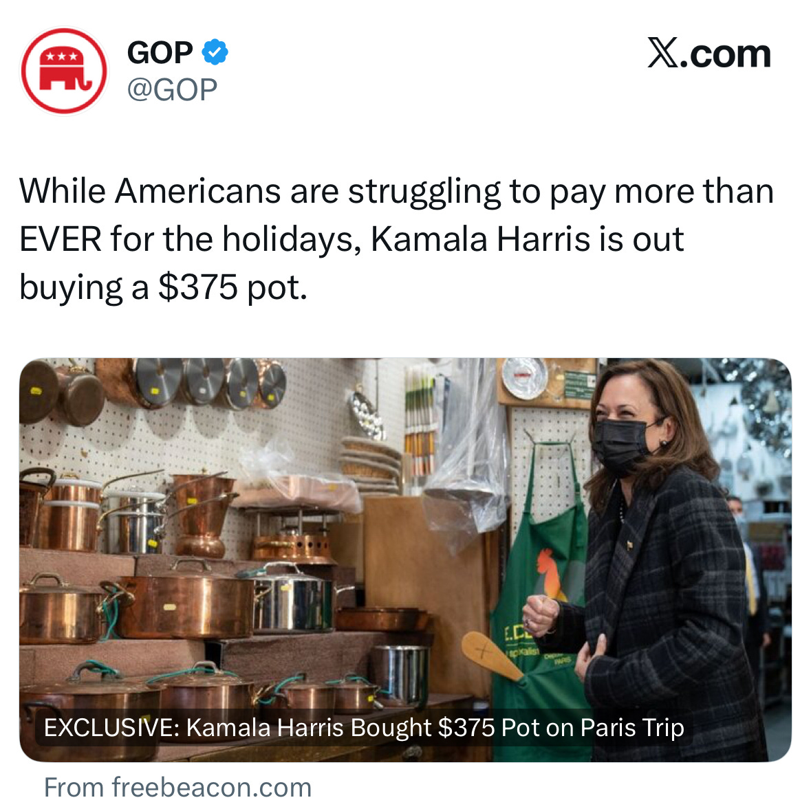 If you think I’m exaggerating, I’ll remind you of the absurd fallout when Harris behaved like a normal American tourist and purchased a souvenir pot during a trip to Paris in 2021. The Washington Free Beacon wrote: “Amid economic turmoil and calls to buy local in the United States, Vice President Kamala Harris dropped nearly $400 for a single pot at a boutique shop in Paris.” And the official GOP Twitter account whined, “While Americans are struggling to pay more than EVER for the holidays, Kamala Harris is out buying a $375 pot.”